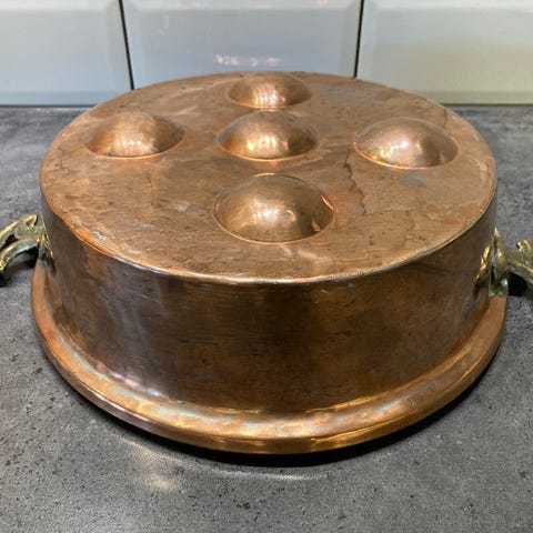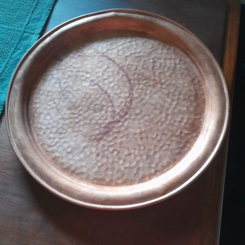 Selger et fint stort fat i kobber samt en kjele.
