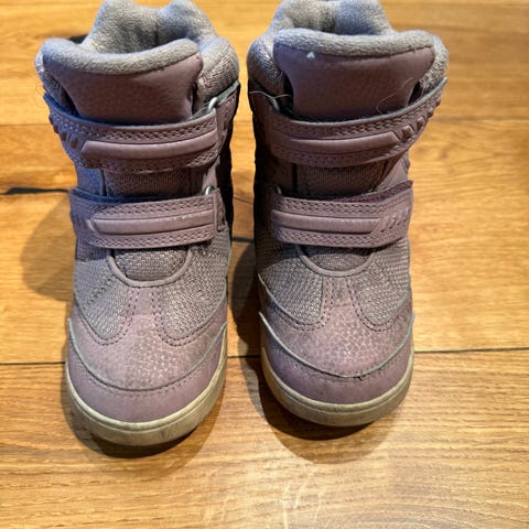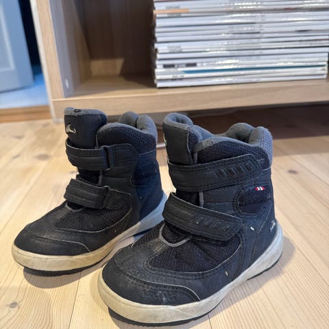 Viking barnesko i størrelse 25. Skoene er svarte med borrelås for enkel justering og har en foret innside for varme og komfort.