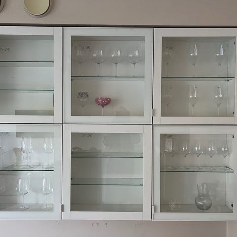 Speilvegg bak forsterker inntrykket av hva du vil «stille» ut. Regulerbare glasshyller. 1/2 pris. Designer er ikke riktig