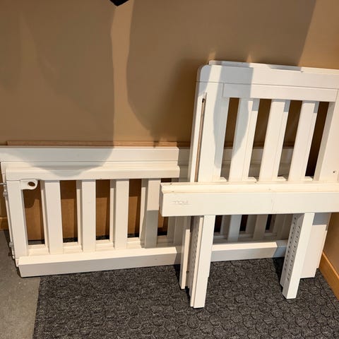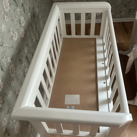 Sprinkelseng til baby reselges ettersom babyen min ikke vil sove i separat seng. Den ene bærestøtten til sengen er litt løs, men den kan fortsatt fint brukes som babyseng. Madrass følger med.