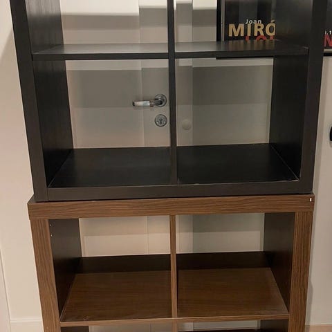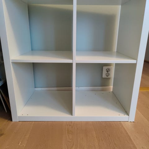 Det følger med 4 dører, 4 skuffemoduler med 2 skuffer i hver, 4 blå bokser og belysning i de åpne rommene. Farge og lysstyrke på belysningen kan varieres