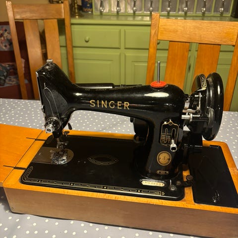 Symaskinen er pent bruk, fungerer som den skal, men jeg har fått en ny symaskin, så jeg har ikke mye bruk for den her. Kommer med utvidelse bord, pedal, nål, og forskjellige tilbehør som kom med symaskinen.