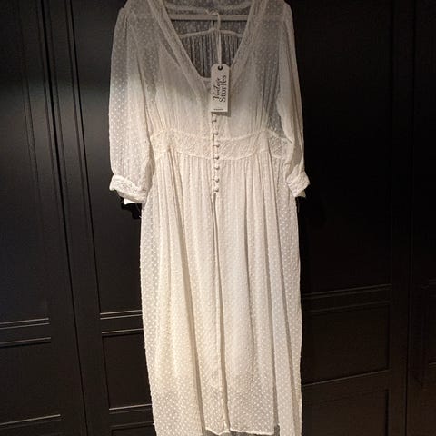 KappAhl kjole i størrelse 40. Kjolen er rød med et mønster, laget av polyester. Passer til både fest og hverdagsbruk.