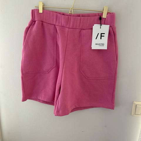Bomullshorts fra Selected. Veldig behagelig med et noe tykkere stoff. Ingen direkte bruksmerker, men synlig på "plysstoffet" på innsiden at den har blitt vasket noen ganger.