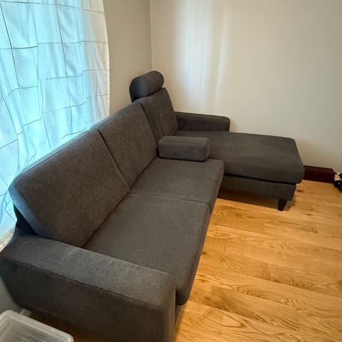 Vi skal sette opp en ekstra vegg, og får da ikke plass til denne sofaen. Dette har ikke vært vår primærsoffa, så den er ikke så mye brukt. Det er satt på benforhøyere slik at robotstøvsugere kan komme under. Disse følger med om ønskelig.