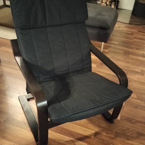 2 stk lenestoler i svart skinn med fotskammel. Polstret sete og ryggstøtte. Stolen har armlener og en komfortabel utforming som passer til avslapning og hvile. Noe slitt på armlener.