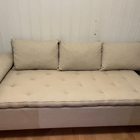 Selger IKEA Ringstorp 3-seters sofa. Sofaen ble kjøpt hos IKEA i 2022 og hadde vært utstillingsvare. Skjevt armlene (se bilde) fra da vi kjøpte den, men som ikke påvirker funksjonen. For alt jeg vet kan dette enkelt ordnes, men det er ikke forsøkt. Stoffet på rygg- og sitteputene er nyvasket og uten flekker/merker. Må hentes i 2. etasje uten heis. Pris kan diskuteres ved rask avhenting.