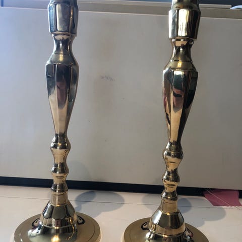 2 stødige, antikke lysestaker I messing. De trenger rens og puss, det er rester etter stearin, men de er solide og fine.
