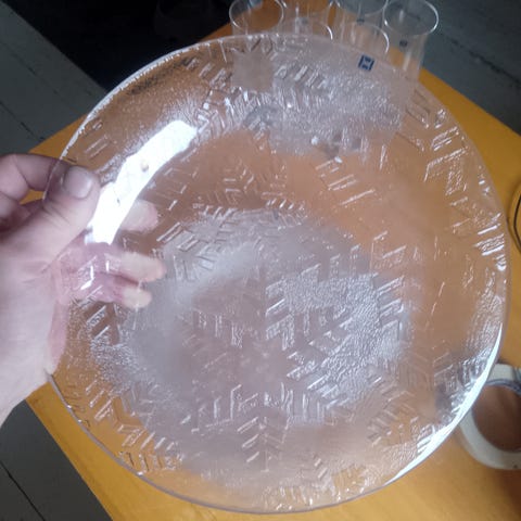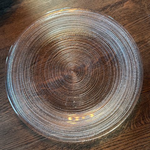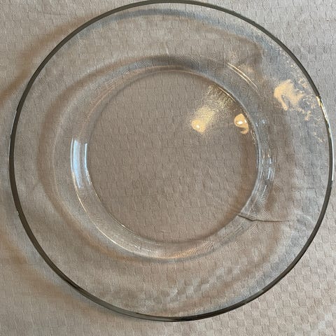 Dekktallerken , men kan også brukes som serveringsfat . Klart glass med gullkant! 10stk , men kan selges separat! 100 pr stk!