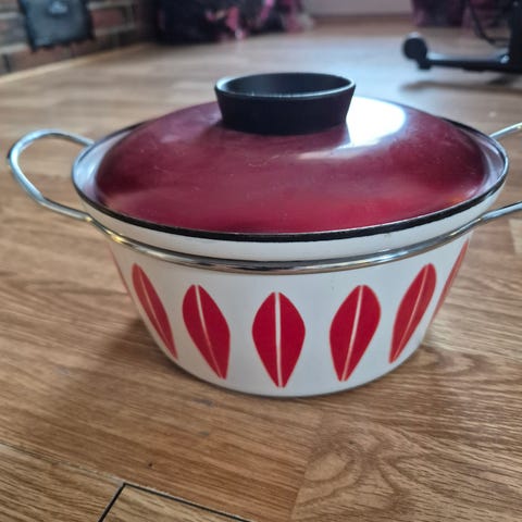 Denne kjelen er feilfri, ingen avskalling. Lokket er Cathrine Holm, er usikker på om kjelen er det. Lokket passer fint. Den rommer opp til kanten 1 og 1/2 liter. Helt full 2 liter. Kan sende med post nord kr 69,