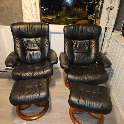 2 stk lenestoler med fotskammel i grått stoff. Lenestolen har polstret rygg og armlener, samt en matchende fotskammel. Passer til stue eller lesekrok.