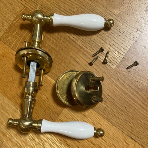 5 stk dørhåndtak i messing inklusive skruer selges samlet