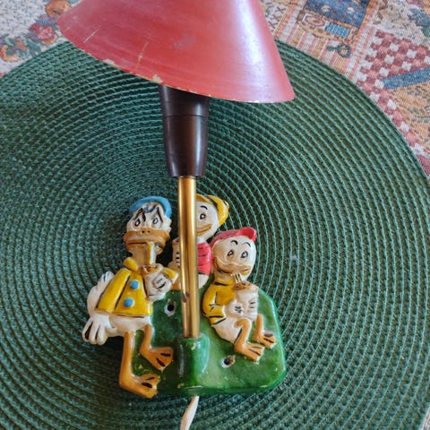Kul lampe, motiv og merket med Disney. Metall lampefot. Litt misfarging på skjermen, ellers hel og fin. Fungerer fint. 27 cm høy