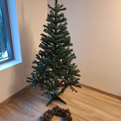 Selger Kunstig juletre i 150cm høyde og julekrans for 100kr.