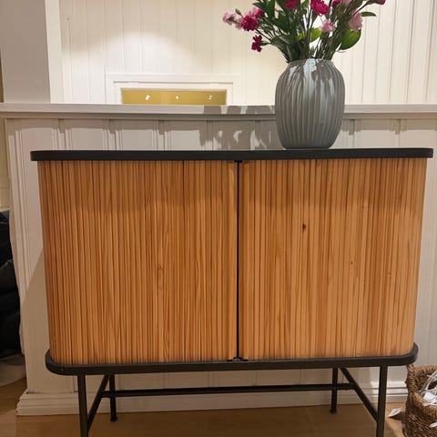 H&M Home nattbord med svart ramme og naturfarget sjalusidører. Møbelet har en åpen hylle og et skap med skyvedører. Materialvalg og design gjør det egnet for oppbevaring ved siden av seng eller i andre rom. Møbelet har noen få merker, men dette syns ikke så godt.