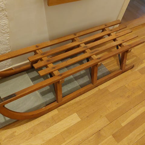 Bunnsolid kjelke. Alt tremateriale er nytt, alt metall ( meier, beslag og ringer til å feste tau ) fra en gammel kjelke der treverket var utslitt. Mål 137 cm lang, 33 cm bred og 17 cm høy.