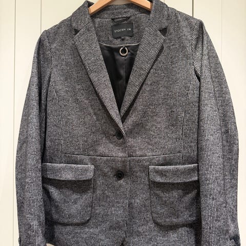 Stockholm blazer i svart farge laget av ullmateriale. Jakken er designet for kvinner og har størrelse 42. Den har en enkel knappelukking og klassisk snitt. Et tidløst plagg som kan brukes både til hverdags og formellt. Pent brukt.