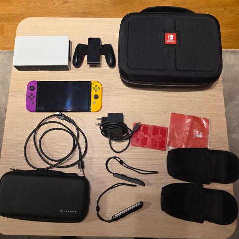 Nintendo Switch Oled, kjøpt Juni 2023, i super stand. Noen få bruksmerker på skjerm som kunn er merkbare/synes når skjermen er svart. Pakken inkluderer to Joy-Con-kontrollere med adapter, to ratt for Joy-Con kontrollere, tilbehør for håndleddsstropper, Dockingstasjon, strømadapter, USB-A til USB-C og HDMI kabel.