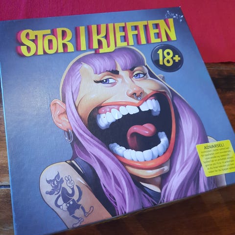 Stor i Kjeften 18+ brettspill med norsk tekst. Spillet er for 2-8 spillere, anbefalt alder 18 år og oppover. Spillvarighet er ca. 30-45 minutter. Inneholder kort med setninger som spillerne må uttale uten å lukke munnen, noe som gir humoristiske utfordringer og underholdning.