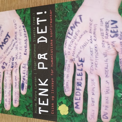 Boken "Tenk på det!" er en trykt utgave med omslag og sider som inneholder tekst og bilder. Humanist Forlag.