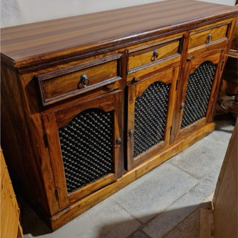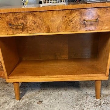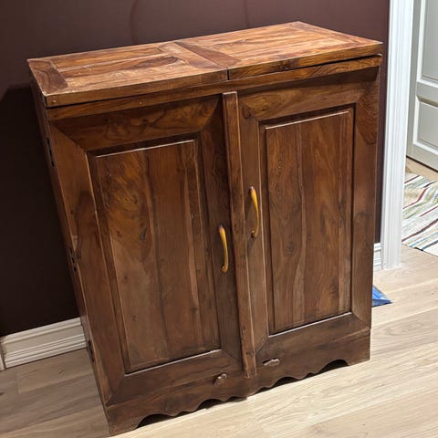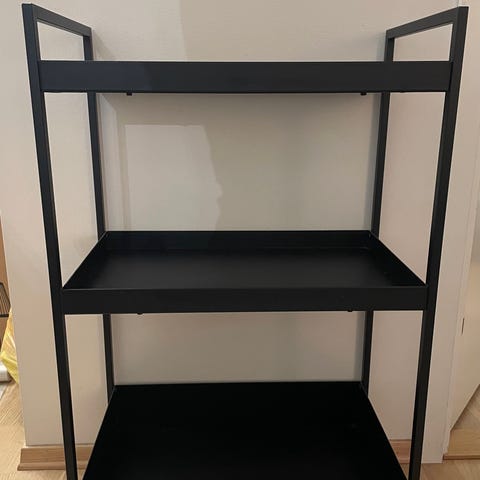 De tre bordplatene er svart lakkert og den ene skruen til den ene stangen bak er borte. Har ingen betydning for bruken. :)