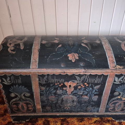 Gulvur, antikt (muligens 1784), overmalt/dekorert på 1980-tallet. Selges/kan hentes lørdag 24. januar mellom 10-16 på Godthåb i Bærum.