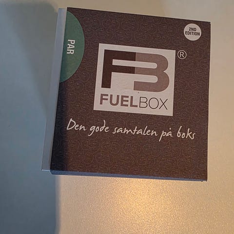 FuelBox Par inneholder 170 åpne spørsmål, fordelt på 10 kategorier, som vil gi dere mulighet til å snakke sammen om viktige, morsomme og alvorlige sider ved livet deres sammen og i livet generelt. Gode samtaler er avgjørende i et parforhold. De gjør at vi føler oss sett, hørt og verdsatt. Gjennom gode samtaler utforsker vi hverandre, reflekterer sammen, vokser sammen, og spesielt viktig; ler sammen!
