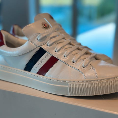 Moncler Sneakers joggesko i størrelse 42. Skoene har perforert design på sidene og er i hvit farge med røde detaljer bak. Egnet for hverdagsbruk.