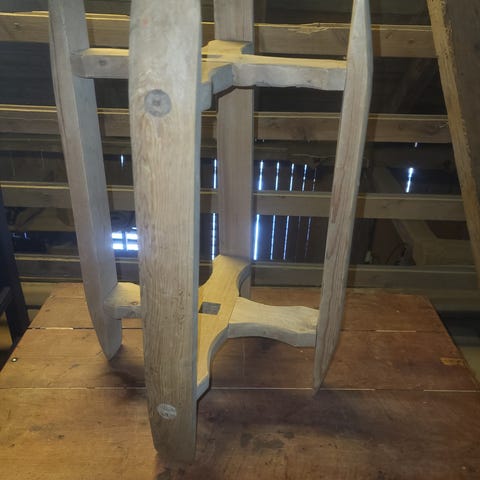 Antikk barnesete/stol i tre fra 1825 Den viser tegn på alder og bruk, med synlige sprekker. Stolen kan ha historisk verdi og brukes som dekorativt element eller samlerobjekt.