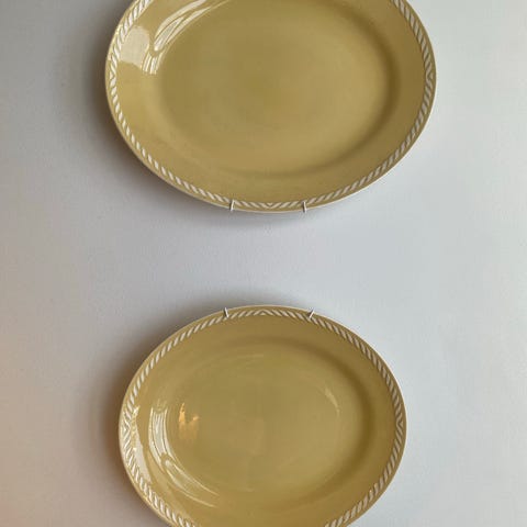 Seks meget pene Figgio gul Sissel suppetellerkener. Ø 22 cm. Litt ulik gulfarge, tre ulike farger på stempler (alle Figgio). To er svakt krakkelert. Fire uten. Alle har tydelig og klar glans. Uten nagg/skall. Selges samlet kr.750. Hentes Greåker eller sendes mot betaling av porto (Fiks ferdig)