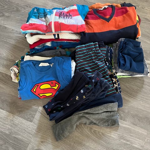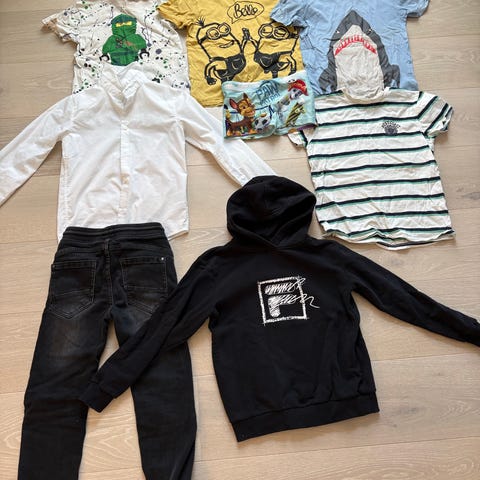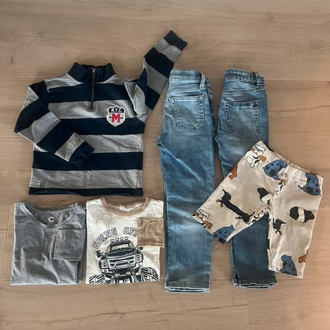 Pent brukt klespakke til gutt i str 110/116 (eller tilsvarende, alle plaggene er brukt på samme tid hos oss) i mørkegrå og grønn farger.
