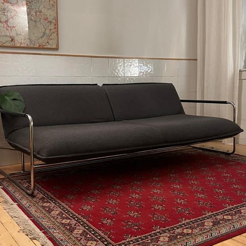 Splitback Frej Eik sovesofa – Innovation Living, pent brukt. Lys blå farge. Kjøper må hente selv. Vekt på sofa er ukjent, men den er relativt tung. Se bilde for målsettinger.