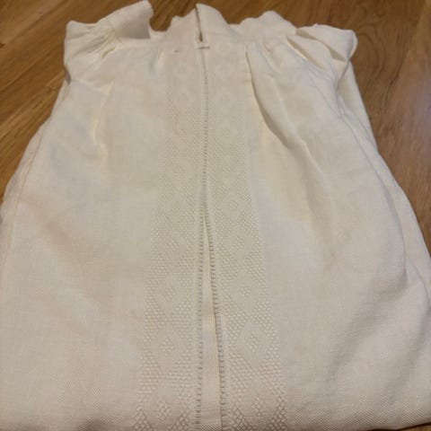 Håndbrodert linskjorte til Rogalandsbunad selges. Skjorten er godt brukt og er av eldre årgang. Hel og fin bortsett fra at broderitråden øvre kant halslinning har gulnet noe. Øvrige broderier på stav og håndledd er ikke gulnet.