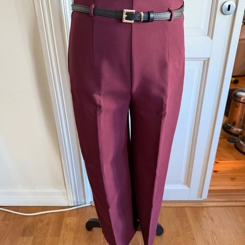 Høyt liv og hemper i siden. Lommer foran og bak. Vide ben. Størrelse S, men føles større.