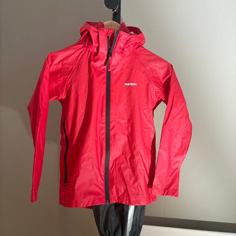 Selger regnsett med regnjakke og bukse fra reflex. Ingen hull eller rifter. Jakken er i god stand mens buksen har refleksen løsnet på det ene beinet (se bilde). Begge strikkene er på.