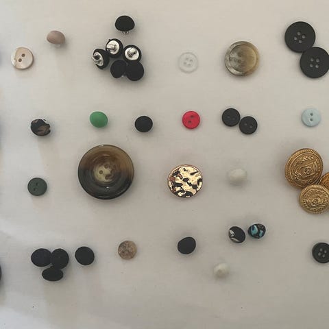 Blandet samling av knapper i forskjellige farger, størrelser og materialer. Kan brukes til syprosjekter, reparasjoner eller dekorative formål.