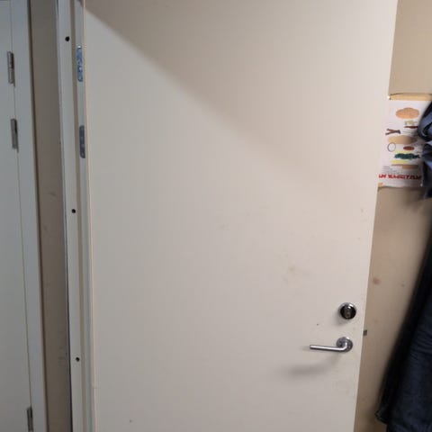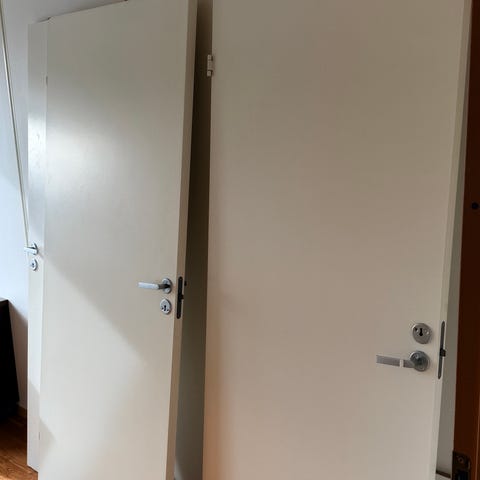 Hvite innerdører med karm. Dørene har hengsler og sluttstykke/låsekasse.