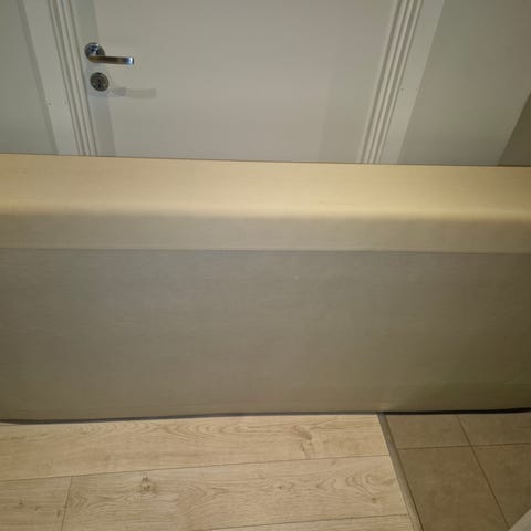 Høie. overmadrass i standard størrelse 90/200 cm med grå kant og hvit overflate. Passer for enkeltseng og kan brukes som underlag for soveplass.pent brukt følger med beskytter