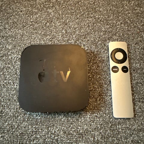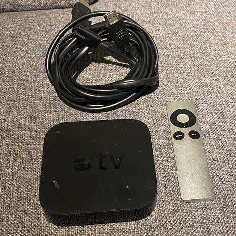 Apple TV med fjernkontroll og tilhørende kabler. Enheten er designet for å streame digitalt innhold til TV. Leveres med fjernkontroll for navigasjon og kontroll, samt nødvendige kabler for tilkobling.