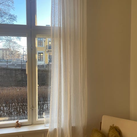 IKEA gardin i 100% linstoff i beige farge. Modell AINA. Gardinen har en naturlig tekstur og er laget av linmateriale, som gir et lyst og luftig uttrykk. Passer til bruk i stue eller soverom for å skjerme for innsyn og gi rommet en mykere atmosfære.