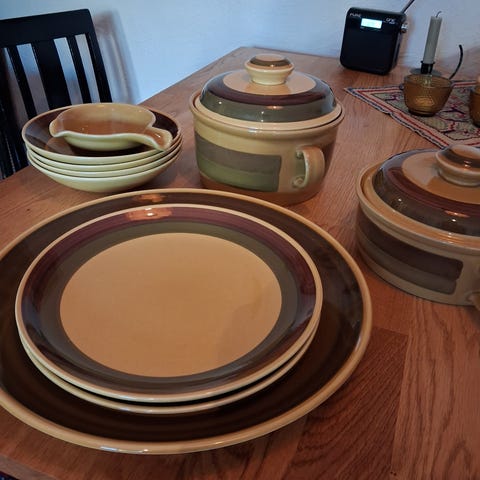 Seks suppetallerkener og en stor mugge. Jeg brukte dem til müsli og melk. Laget av steintøy.