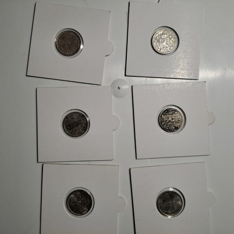 Samling med gamle mynter og medaljer inkludert en 120 Skilling mynt, en 2 Skilling Courant mynt fra 1810, og en medalje med inskripsjon fra 1812-1962. Mynter og medaljer er i varierende materialer og tilstand, egnet for samlere og historisk interesse.