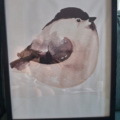 Nostalgisk bilde med småfugler innrammet. Oppheng bak. Måler 36cm høy og 16cm bred.