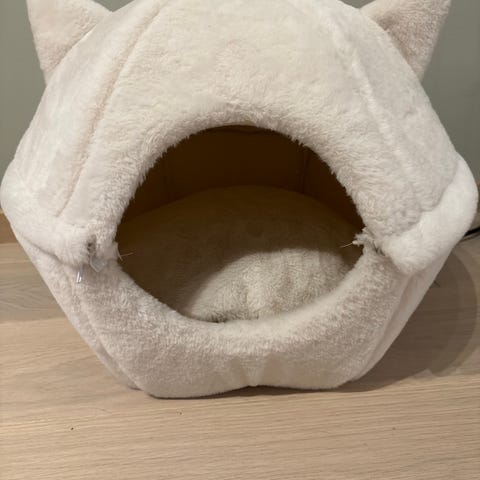 Kattehule i grå og hvit farge til salgs. Den er laget av mykt materiale med en åpning foran og er egnet som et koselig hvilested.