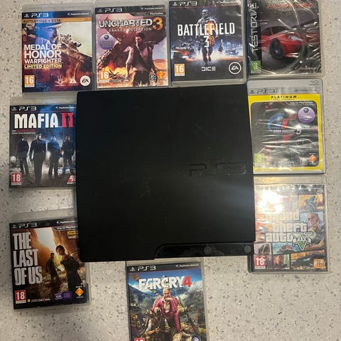 Sony Playstation 3 konsoll med 320 GB lagringskapasitet. Inkluderer trådløs DualShock 3 kontroller og WRC 2 World Rally Championship spill.