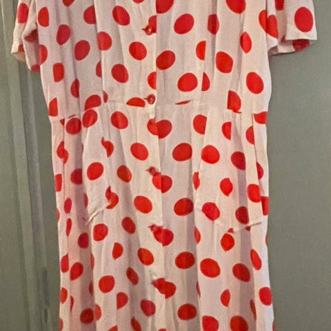 Fin retro kjole produsert i Sverige. Super med en bluse/genser under 🤩 Dype påsydde lommer i front og fine grønne originale knapper foran.