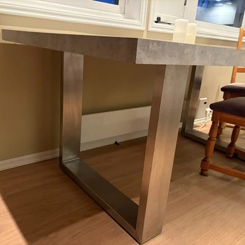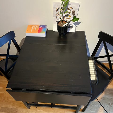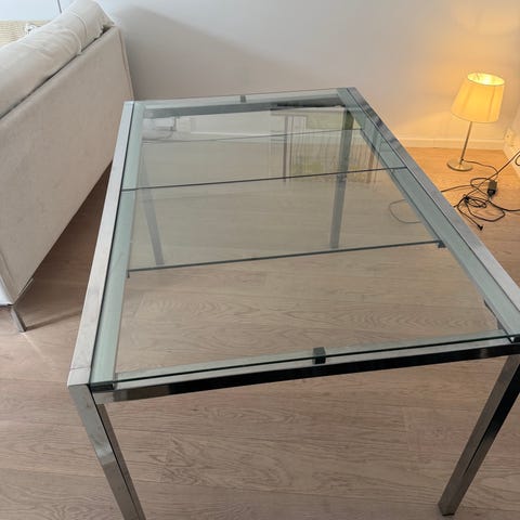 Bord med 4 stoler. De sorte feltene på bordet er glass. Et par riper/flekker.