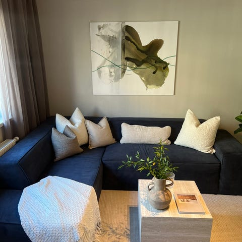 Selger en blå, bork hjørnesofa med endeavslutning og nakkestøtte fra bohus. Kjøpt i 2023, pent brukt.