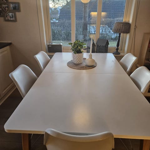 Spisebord med 6 stoler selges. Bordet kan romme 8 pers med ekstra stoler. Selges samlet, må hentes.