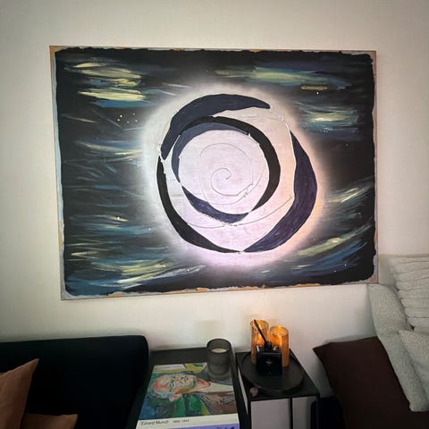 Unikt, håndmalt abstrakt kunstverk med et sterkt og balansert uttrykk. Maleriet har en dynamisk spiralform i dype blå- og sorte toner mot en metallisk, lys bakgrunn som gir dybde og liv avhengig av lys og rom.
